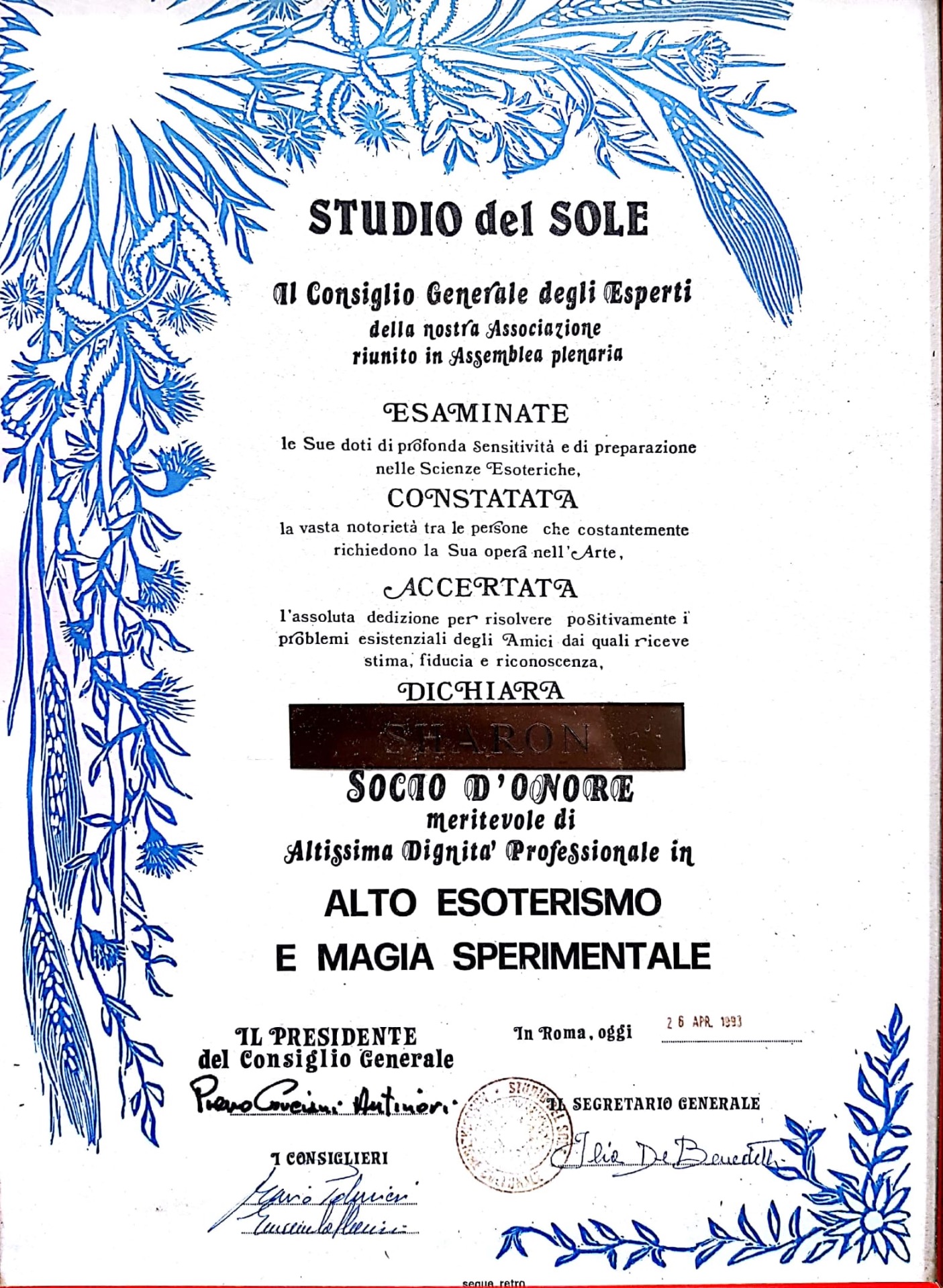 I corsi venivano svolti a Roma presso lo "Studio del Sole"e a Genova presso "Ordine dell'Occultisti d'Italia".